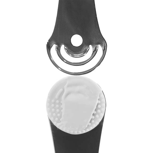 THE SMILIST's pro tongue scraper has a tip to clean the tongue with a dab of toothpaste and a second tip to scrape away bacteria from the tongue.