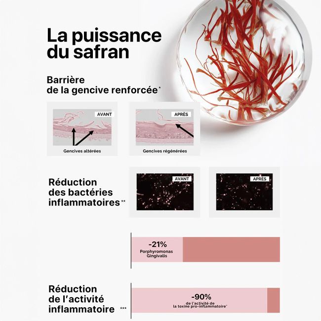 Saffron extract: A soothing phytoactive ingredient known for its anti-inflammatory properties. It acts as a protective shield by limiting the adhesion of bacteria involved in inflammation, for healthier gums.