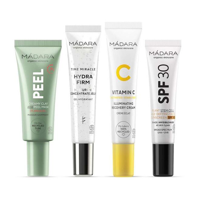 The Mádara Skin Stars gift set contains four miniature facial care products: the Peel 7% AHA exfoliating mask, Age Pro Hydra Firm hyaluronic gel, vitamin C cream, and SPF30 anti-aging sunscreen.