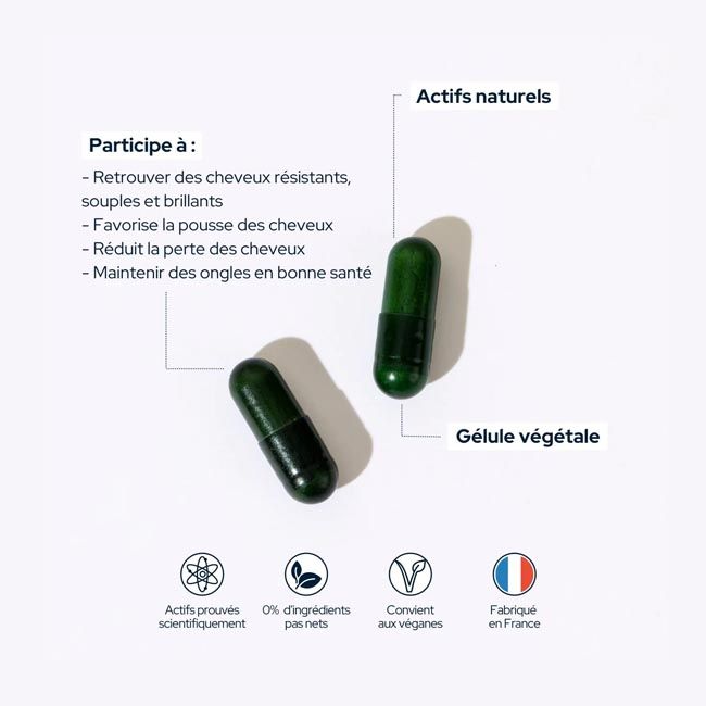 This natural food supplement naturally strengthens the resistance, suppleness and shine of the hair.Â
