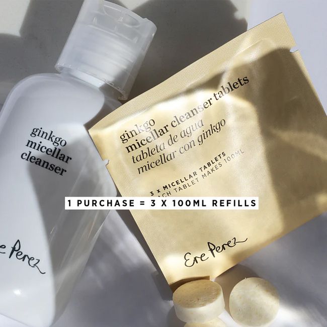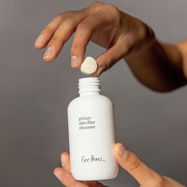 Ere Perez Ginkgo Micellar Cleanser is the first waterless micellar cleanser. Combining effectiveness, care, and convenience, it comes in an innovative refillable tablet format. Thanks to its water-activated formula, daily cleansing becomes a gentle experience for the skin, effective against impurities and environmentally friendly.
