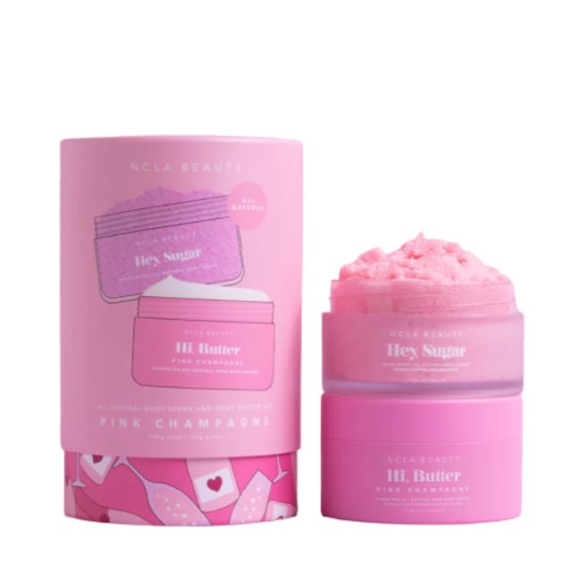 NCLA Beauty's Pink Champagne discovery set includes Hey, Sugar body scrub and Hi, Butter body butter in Pink Champagne fragrance.