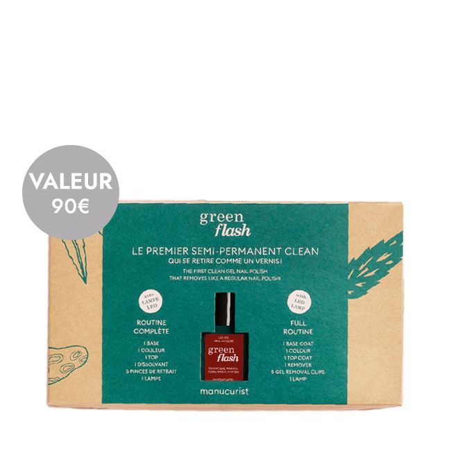 Le kit manucure Essentiels Green Flash MANUCURIST réunit la lampe UV, la base coat, 1 vernis coloré, le top coat, le dissolvant et 5 pinces de retrait.