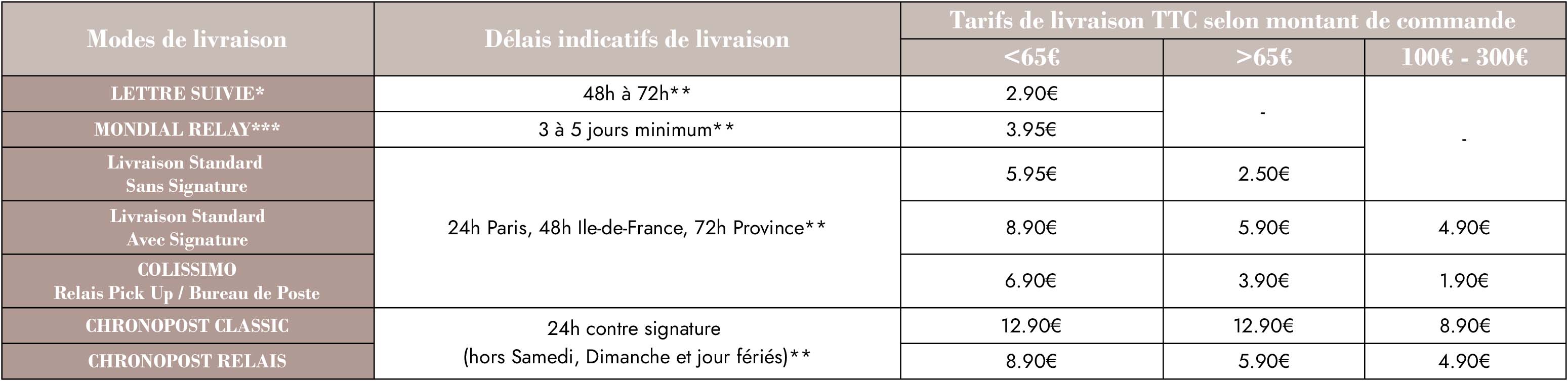 **Les délais de livraison généralement constatés par Colissimo Expert International sont compris entre 3 et 15 jours ouvrés. Ces délais sont toutefois communiqués à titre indicatif car nous ne maîtrisons pas d'éventuels retards liés à l'organisation de la Poste.