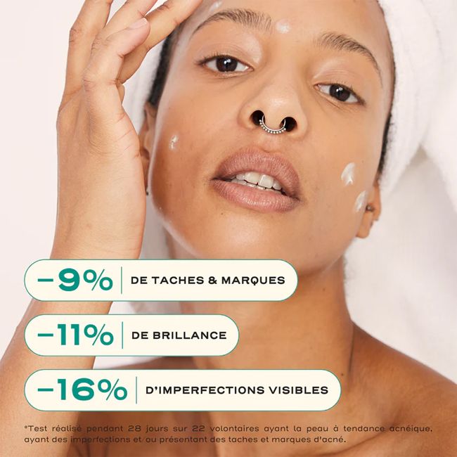 *Test d'usage de 28 jours, sur 22 volontaires âgés de 18 à 60 ans, ayant la peau grasse ou mixte grasse à tendance acnéique, avec des imperfections et/ou des marques d'acné.