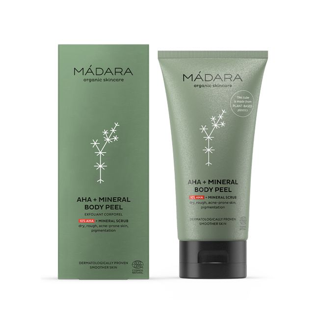 L’exfoliant corps AHA + Mineral MADARA élimine les cellules mortes, désobstrue les pores et unifie la peau.