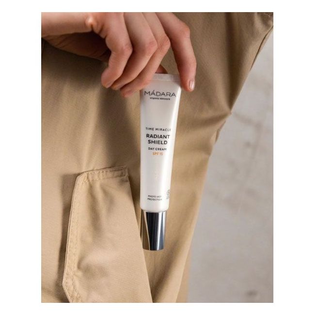 La crème anti age Time Miracle SPF15 MADARA repulpe, redonne de l'éclat et protège la peau des UVA et UVB.