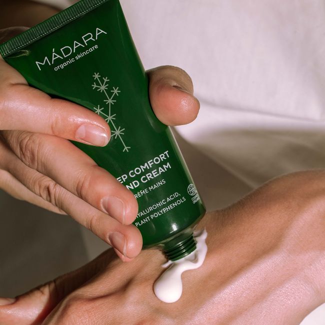 La crème mains bio MADARA adoucit les peaux les plus sèches et offre une sensation de bien-être immédiate.